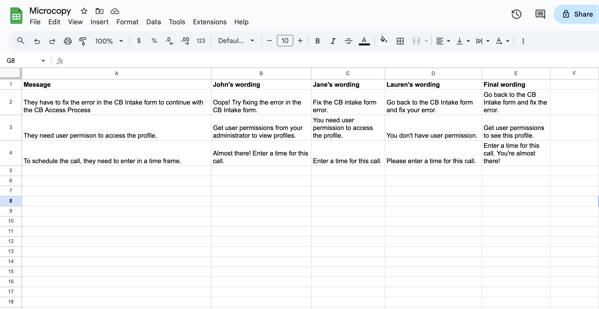 Collaboration: A product manager, UX designer, and I chose to jointly write in-app notifications. We recognized that we all had good ideas for wording. It often worked best when we combined our ideas. To do this, we wrote our ideas for the microcopy into a spreadsheet. We were able to combine the best wording from each contributor to create the best possible sentence.